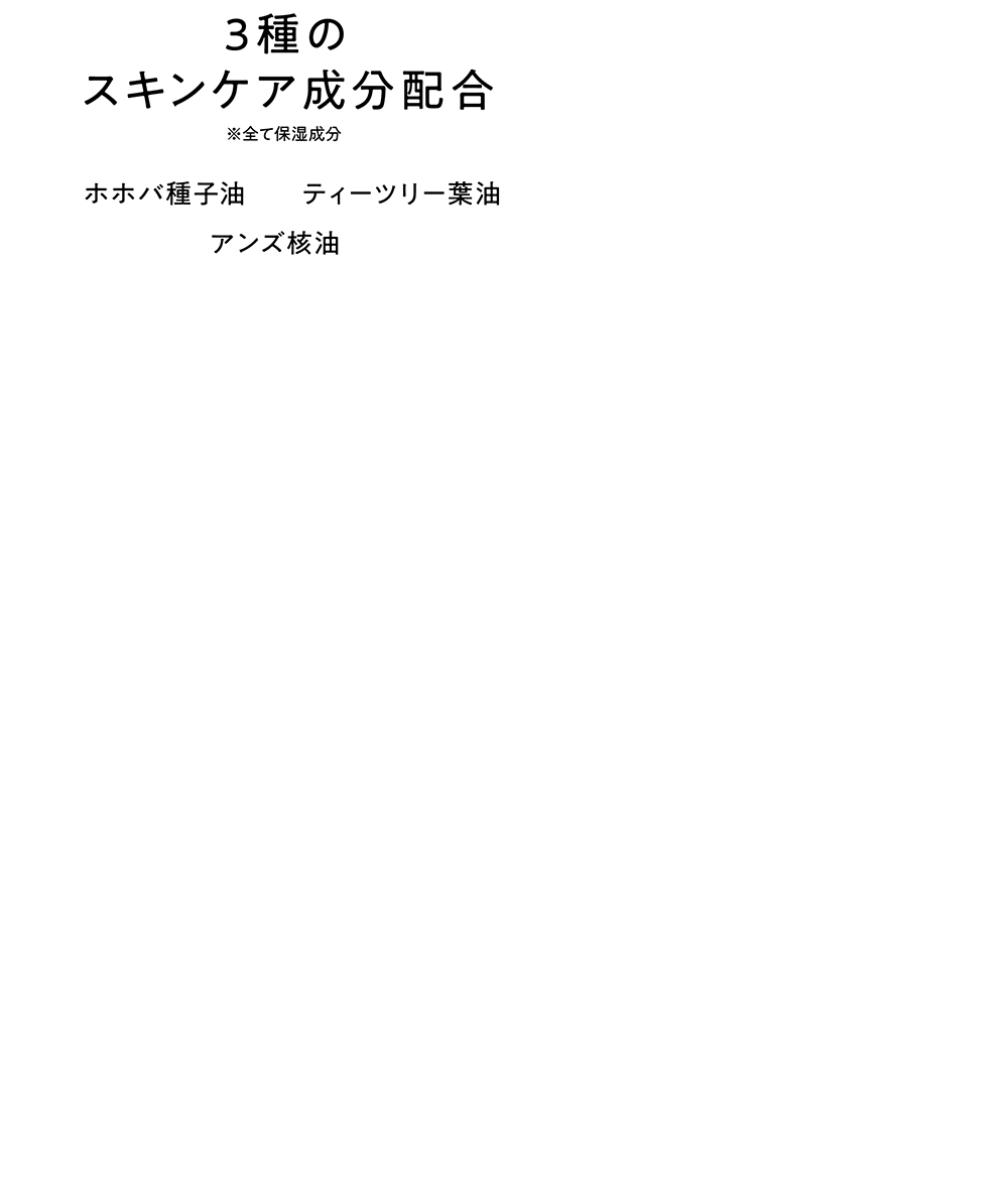 リンゴ酸ジイソステアリル、合成フルオロフロゴパイト、(ジメチコン/ビニルジメチコン)クロスポリマー、酸化チタン、メタクリル酸メチルクロスポリマー、ラウリン酸ヘキシル、ジメチコン、タルク、フェニルトリメチコン、シリカ、ラウロイルリシン、ポリメチルシルセスキオキサン、1,2-ヘキサンジオール、ジメチコンクロスポリマー、トリ(カプリル酸/カプリン酸)グリセリル、水酸化Al、トリエトキシカプリリルシラン、カプリリルグリコール、グンジョウ、赤226、黄4、メチコン、カプリル酸グリセリル、酸化鉄、ティーツリー葉油、アンズ核油、ホホバ種子油