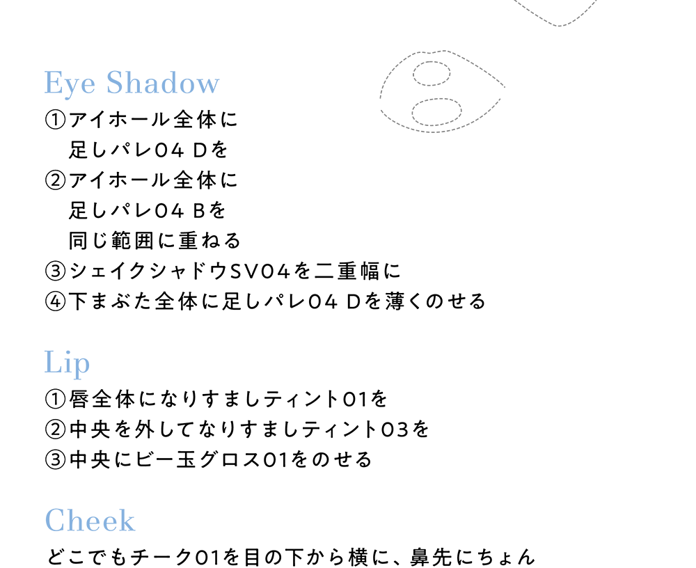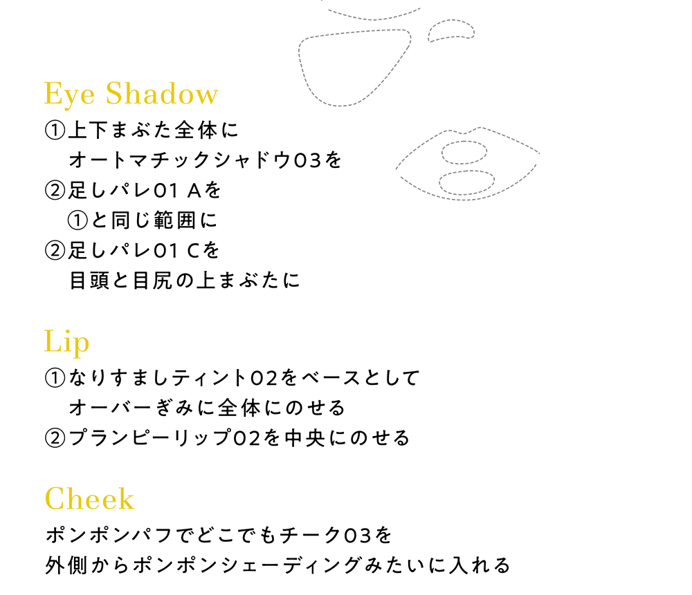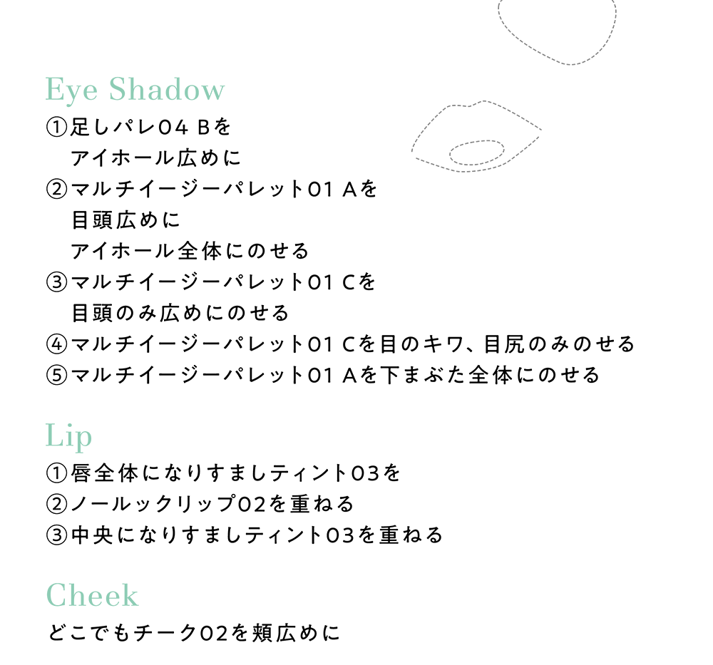 リンゴ酸ジイソステアリル、合成フルオロフロゴパイト、(ジメチコン/ビニルジメチコン)クロスポリマー、酸化チタン、メタクリル酸メチルクロスポリマー、ラウリン酸ヘキシル、ジメチコン、タルク、フェニルトリメチコン、シリカ、ラウロイルリシン、ポリメチルシルセスキオキサン、1,2-ヘキサンジオール、黄4、ジメチコンクロスポリマー、トリ(カプリル酸/カプリン酸)グリセリル、水酸化Al、トリエトキシカプリリルシラン、カプリリルグリコール、赤226、メチコン、酸化鉄、カプリル酸グリセリル、ティーツリー葉油、アンズ核油、ホホバ種子油