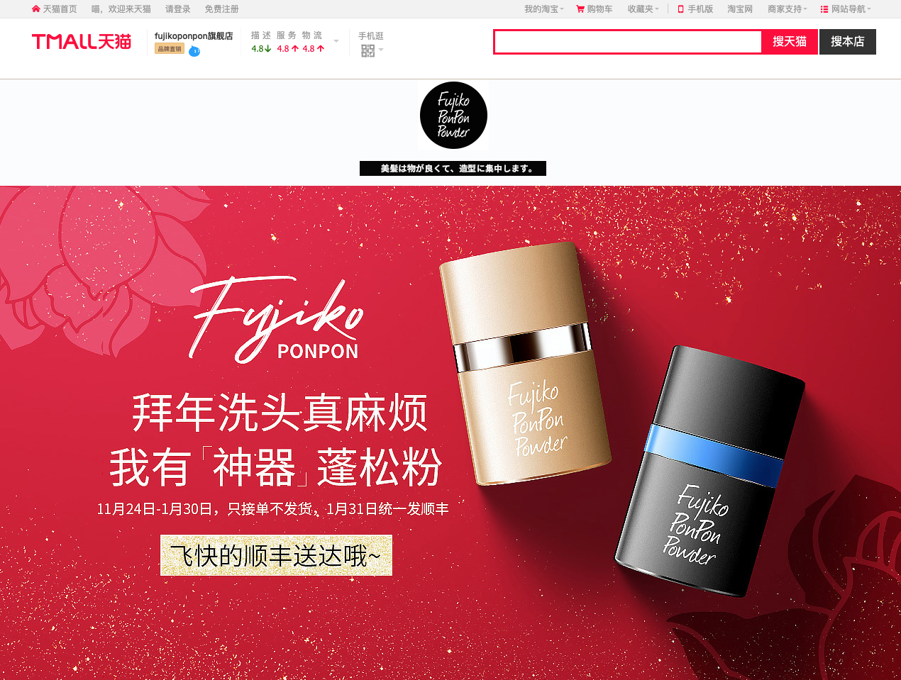 この「Fujiko海外旗艦店」では、下記のとおり、弊社の「FPP Powder」(旧商品名:Fujiko PonPon Powder)を含む、「Fujiko」シリーズの商品全般を中国国内向けに販売しています。