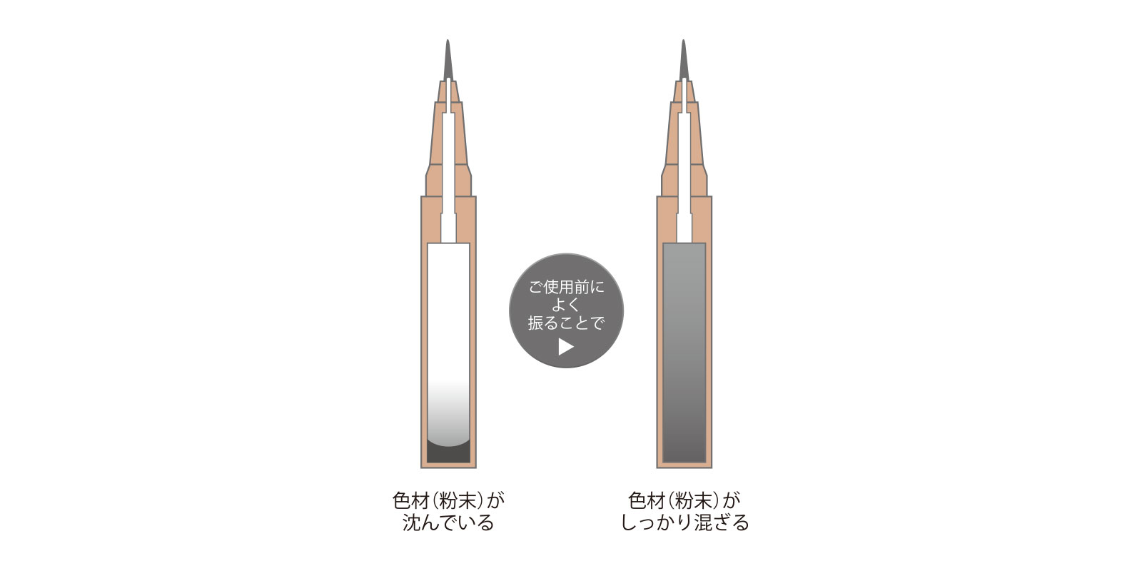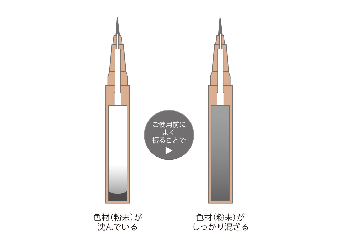 アイライナーの色は色材(粉末)で出しています。最初にご使用になる前や、長期間ご使用になっていない場合は、色材(粉末)が沈んでいるため、キャップを閉めた状態でよく振ってお使いください。